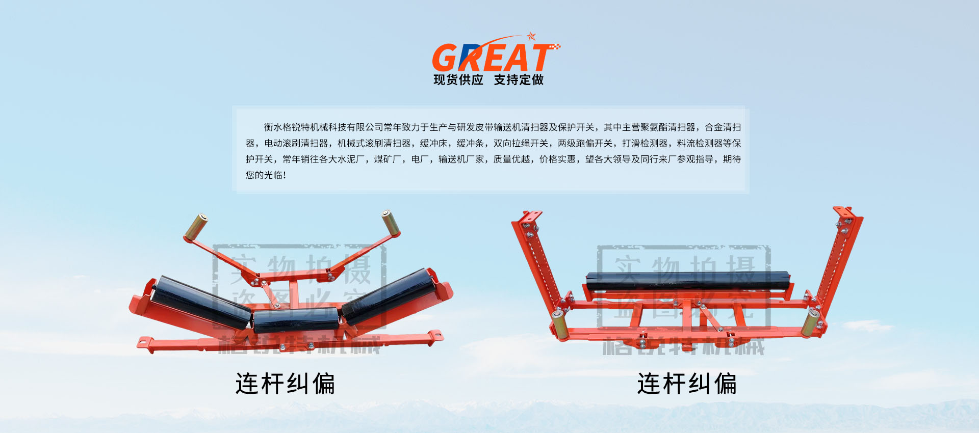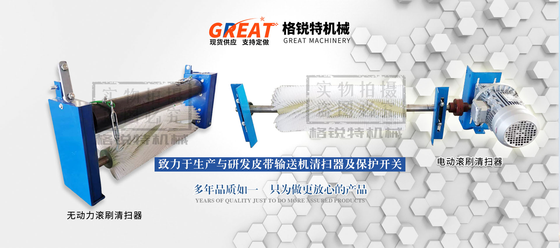 衡水格銳特機(jī)械科技有限公司常年致力于生產(chǎn)與研發(fā)皮帶輸送機(jī)清掃器及保護(hù)開(kāi)關(guān),其中主營(yíng)聚氨酯清掃器,合金清掃器,電動(dòng)滾刷清掃器,機(jī)械式滾刷清掃器,緩沖床,緩沖條,雙向拉繩開(kāi)關(guān),兩級(jí)跑偏開(kāi)關(guān),打滑檢測(cè)器,料流檢測(cè)器等保護(hù)開(kāi)關(guān),常年銷(xiāo)往各大水泥廠,煤礦廠,電廠,輸送機(jī)廠家,質(zhì)量?jī)?yōu)越,價(jià)格實(shí)惠,望各大領(lǐng)導(dǎo)及同行來(lái)廠參觀指導(dǎo),期待您的光臨?。?!